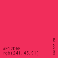 Цвет #F12D5B в цветовой модели RGB обозначается тремя октетами (241, 45, 91) в десятичном формате и #F12D5B в шестнадцатиричном (hex) формате, которые являются интенсивностью красного 241 (hex F1), интенсивность зелёного 45 (hex 2D) и интенсивность синего 91 (hex 5B).
