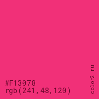 Цвет #F13078 в цветовой модели RGB обозначается тремя октетами (241, 48, 120) в десятичном формате и #F13078 в шестнадцатиричном (hex) формате, которые являются интенсивностью красного 241 (hex F1), интенсивность зелёного 48 (hex 30) и интенсивность синего 120 (hex 78).