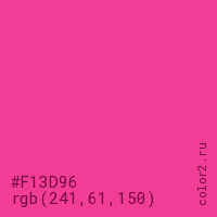 Цвет #F13D96 в цветовой модели RGB обозначается тремя октетами (241, 61, 150) в десятичном формате и #F13D96 в шестнадцатиричном (hex) формате, которые являются интенсивностью красного 241 (hex F1), интенсивность зелёного 61 (hex 3D) и интенсивность синего 150 (hex 96).