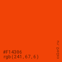 Цвет #F14306 в цветовой модели RGB обозначается тремя октетами (241, 67, 6) в десятичном формате и #F14306 в шестнадцатиричном (hex) формате, которые являются интенсивностью красного 241 (hex F1), интенсивность зелёного 67 (hex 43) и интенсивность синего 6 (hex 06).