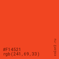 Цвет #F14521 в цветовой модели RGB обозначается тремя октетами (241, 69, 33) в десятичном формате и #F14521 в шестнадцатиричном (hex) формате, которые являются интенсивностью красного 241 (hex F1), интенсивность зелёного 69 (hex 45) и интенсивность синего 33 (hex 21).