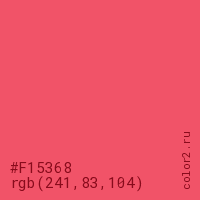 Цвет #F15368 в цветовой модели RGB обозначается тремя октетами (241, 83, 104) в десятичном формате и #F15368 в шестнадцатиричном (hex) формате, которые являются интенсивностью красного 241 (hex F1), интенсивность зелёного 83 (hex 53) и интенсивность синего 104 (hex 68).