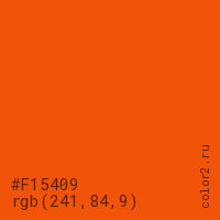Цвет #F15409 в цветовой модели RGB обозначается тремя октетами (241, 84, 9) в десятичном формате и #F15409 в шестнадцатиричном (hex) формате, которые являются интенсивностью красного 241 (hex F1), интенсивность зелёного 84 (hex 54) и интенсивность синего 9 (hex 09).
