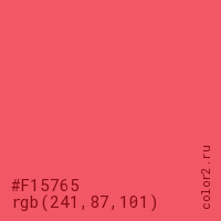 Цвет #F15765 в цветовой модели RGB обозначается тремя октетами (241, 87, 101) в десятичном формате и #F15765 в шестнадцатиричном (hex) формате, которые являются интенсивностью красного 241 (hex F1), интенсивность зелёного 87 (hex 57) и интенсивность синего 101 (hex 65).