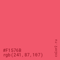 Цвет #F1576B в цветовой модели RGB обозначается тремя октетами (241, 87, 107) в десятичном формате и #F1576B в шестнадцатиричном (hex) формате, которые являются интенсивностью красного 241 (hex F1), интенсивность зелёного 87 (hex 57) и интенсивность синего 107 (hex 6B).