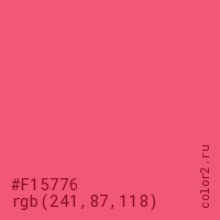 Цвет #F15776 в цветовой модели RGB обозначается тремя октетами (241, 87, 118) в десятичном формате и #F15776 в шестнадцатиричном (hex) формате, которые являются интенсивностью красного 241 (hex F1), интенсивность зелёного 87 (hex 57) и интенсивность синего 118 (hex 76).