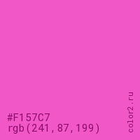 Цвет #F157C7 в цветовой модели RGB обозначается тремя октетами (241, 87, 199) в десятичном формате и #F157C7 в шестнадцатиричном (hex) формате, которые являются интенсивностью красного 241 (hex F1), интенсивность зелёного 87 (hex 57) и интенсивность синего 199 (hex C7).
