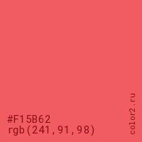 Цвет #F15B62 в цветовой модели RGB обозначается тремя октетами (241, 91, 98) в десятичном формате и #F15B62 в шестнадцатиричном (hex) формате, которые являются интенсивностью красного 241 (hex F1), интенсивность зелёного 91 (hex 5B) и интенсивность синего 98 (hex 62).