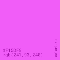 Цвет #F15DF8 в цветовой модели RGB обозначается тремя октетами (241, 93, 248) в десятичном формате и #F15DF8 в шестнадцатиричном (hex) формате, которые являются интенсивностью красного 241 (hex F1), интенсивность зелёного 93 (hex 5D) и интенсивность синего 248 (hex F8).