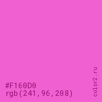 Цвет #F160D0 в цветовой модели RGB обозначается тремя октетами (241, 96, 208) в десятичном формате и #F160D0 в шестнадцатиричном (hex) формате, которые являются интенсивностью красного 241 (hex F1), интенсивность зелёного 96 (hex 60) и интенсивность синего 208 (hex D0).