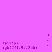 Цвет #F161FF в цветовой модели RGB обозначается тремя октетами (241, 97, 255) в десятичном формате и #F161FF в шестнадцатиричном (hex) формате, которые являются интенсивностью красного 241 (hex F1), интенсивность зелёного 97 (hex 61) и интенсивность синего 255 (hex FF).