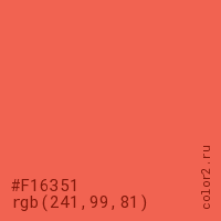 Цвет #F16351 в цветовой модели RGB обозначается тремя октетами (241, 99, 81) в десятичном формате и #F16351 в шестнадцатиричном (hex) формате, которые являются интенсивностью красного 241 (hex F1), интенсивность зелёного 99 (hex 63) и интенсивность синего 81 (hex 51).