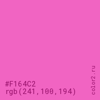 Цвет #F164C2 в цветовой модели RGB обозначается тремя октетами (241, 100, 194) в десятичном формате и #F164C2 в шестнадцатиричном (hex) формате, которые являются интенсивностью красного 241 (hex F1), интенсивность зелёного 100 (hex 64) и интенсивность синего 194 (hex C2).