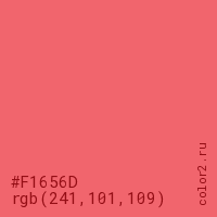 Цвет #F1656D в цветовой модели RGB обозначается тремя октетами (241, 101, 109) в десятичном формате и #F1656D в шестнадцатиричном (hex) формате, которые являются интенсивностью красного 241 (hex F1), интенсивность зелёного 101 (hex 65) и интенсивность синего 109 (hex 6D).
