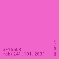 Цвет #F165CB в цветовой модели RGB обозначается тремя октетами (241, 101, 203) в десятичном формате и #F165CB в шестнадцатиричном (hex) формате, которые являются интенсивностью красного 241 (hex F1), интенсивность зелёного 101 (hex 65) и интенсивность синего 203 (hex CB).