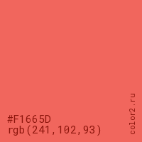 Цвет #F1665D в цветовой модели RGB обозначается тремя октетами (241, 102, 93) в десятичном формате и #F1665D в шестнадцатиричном (hex) формате, которые являются интенсивностью красного 241 (hex F1), интенсивность зелёного 102 (hex 66) и интенсивность синего 93 (hex 5D).