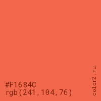 Цвет #F1684C в цветовой модели RGB обозначается тремя октетами (241, 104, 76) в десятичном формате и #F1684C в шестнадцатиричном (hex) формате, которые являются интенсивностью красного 241 (hex F1), интенсивность зелёного 104 (hex 68) и интенсивность синего 76 (hex 4C).