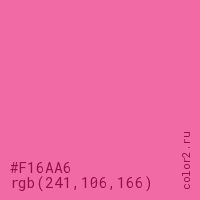 Цвет #F16AA6 в цветовой модели RGB обозначается тремя октетами (241, 106, 166) в десятичном формате и #F16AA6 в шестнадцатиричном (hex) формате, которые являются интенсивностью красного 241 (hex F1), интенсивность зелёного 106 (hex 6A) и интенсивность синего 166 (hex A6).
