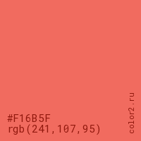 Цвет #F16B5F в цветовой модели RGB обозначается тремя октетами (241, 107, 95) в десятичном формате и #F16B5F в шестнадцатиричном (hex) формате, которые являются интенсивностью красного 241 (hex F1), интенсивность зелёного 107 (hex 6B) и интенсивность синего 95 (hex 5F).