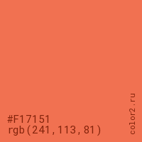 Цвет #F17151 в цветовой модели RGB обозначается тремя октетами (241, 113, 81) в десятичном формате и #F17151 в шестнадцатиричном (hex) формате, которые являются интенсивностью красного 241 (hex F1), интенсивность зелёного 113 (hex 71) и интенсивность синего 81 (hex 51).