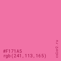 Цвет #F171A5 в цветовой модели RGB обозначается тремя октетами (241, 113, 165) в десятичном формате и #F171A5 в шестнадцатиричном (hex) формате, которые являются интенсивностью красного 241 (hex F1), интенсивность зелёного 113 (hex 71) и интенсивность синего 165 (hex A5).