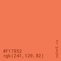 Цвет #F17852 в цветовой модели RGB обозначается тремя октетами (241, 120, 82) в десятичном формате и #F17852 в шестнадцатиричном (hex) формате, которые являются интенсивностью красного 241 (hex F1), интенсивность зелёного 120 (hex 78) и интенсивность синего 82 (hex 52).
