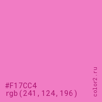 Цвет #F17CC4 в цветовой модели RGB обозначается тремя октетами (241, 124, 196) в десятичном формате и #F17CC4 в шестнадцатиричном (hex) формате, которые являются интенсивностью красного 241 (hex F1), интенсивность зелёного 124 (hex 7C) и интенсивность синего 196 (hex C4).