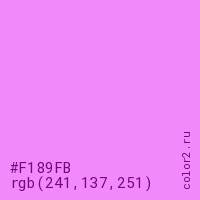 Цвет #F189FB в цветовой модели RGB обозначается тремя октетами (241, 137, 251) в десятичном формате и #F189FB в шестнадцатиричном (hex) формате, которые являются интенсивностью красного 241 (hex F1), интенсивность зелёного 137 (hex 89) и интенсивность синего 251 (hex FB).