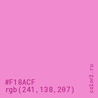 Цвет #F18ACF в цветовой модели RGB обозначается тремя октетами (241, 138, 207) в десятичном формате и #F18ACF в шестнадцатиричном (hex) формате, которые являются интенсивностью красного 241 (hex F1), интенсивность зелёного 138 (hex 8A) и интенсивность синего 207 (hex CF).