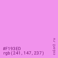 Цвет #F193ED в цветовой модели RGB обозначается тремя октетами (241, 147, 237) в десятичном формате и #F193ED в шестнадцатиричном (hex) формате, которые являются интенсивностью красного 241 (hex F1), интенсивность зелёного 147 (hex 93) и интенсивность синего 237 (hex ED).