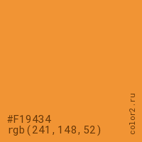 Цвет #F19434 в цветовой модели RGB обозначается тремя октетами (241, 148, 52) в десятичном формате и #F19434 в шестнадцатиричном (hex) формате, которые являются интенсивностью красного 241 (hex F1), интенсивность зелёного 148 (hex 94) и интенсивность синего 52 (hex 34).
