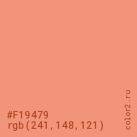 Цвет #F19479 в цветовой модели RGB обозначается тремя октетами (241, 148, 121) в десятичном формате и #F19479 в шестнадцатиричном (hex) формате, которые являются интенсивностью красного 241 (hex F1), интенсивность зелёного 148 (hex 94) и интенсивность синего 121 (hex 79).