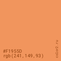 Цвет #F1955D в цветовой модели RGB обозначается тремя октетами (241, 149, 93) в десятичном формате и #F1955D в шестнадцатиричном (hex) формате, которые являются интенсивностью красного 241 (hex F1), интенсивность зелёного 149 (hex 95) и интенсивность синего 93 (hex 5D).