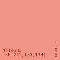 Цвет #F19686 в цветовой модели RGB обозначается тремя октетами (241, 150, 134) в десятичном формате и #F19686 в шестнадцатиричном (hex) формате, которые являются интенсивностью красного 241 (hex F1), интенсивность зелёного 150 (hex 96) и интенсивность синего 134 (hex 86).