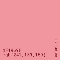 Цвет #F1969F в цветовой модели RGB обозначается тремя октетами (241, 150, 159) в десятичном формате и #F1969F в шестнадцатиричном (hex) формате, которые являются интенсивностью красного 241 (hex F1), интенсивность зелёного 150 (hex 96) и интенсивность синего 159 (hex 9F).