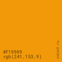 Цвет #F19909 в цветовой модели RGB обозначается тремя октетами (241, 153, 9) в десятичном формате и #F19909 в шестнадцатиричном (hex) формате, которые являются интенсивностью красного 241 (hex F1), интенсивность зелёного 153 (hex 99) и интенсивность синего 9 (hex 09).