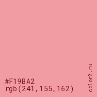 Цвет #F19BA2 в цветовой модели RGB обозначается тремя октетами (241, 155, 162) в десятичном формате и #F19BA2 в шестнадцатиричном (hex) формате, которые являются интенсивностью красного 241 (hex F1), интенсивность зелёного 155 (hex 9B) и интенсивность синего 162 (hex A2).