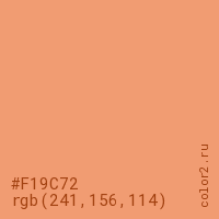 Цвет #F19C72 в цветовой модели RGB обозначается тремя октетами (241, 156, 114) в десятичном формате и #F19C72 в шестнадцатиричном (hex) формате, которые являются интенсивностью красного 241 (hex F1), интенсивность зелёного 156 (hex 9C) и интенсивность синего 114 (hex 72).