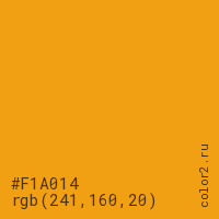 Цвет #F1A014 в цветовой модели RGB обозначается тремя октетами (241, 160, 20) в десятичном формате и #F1A014 в шестнадцатиричном (hex) формате, которые являются интенсивностью красного 241 (hex F1), интенсивность зелёного 160 (hex A0) и интенсивность синего 20 (hex 14).