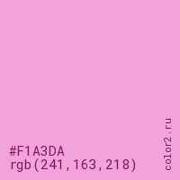 Цвет #F1A3DA в цветовой модели RGB обозначается тремя октетами (241, 163, 218) в десятичном формате и #F1A3DA в шестнадцатиричном (hex) формате, которые являются интенсивностью красного 241 (hex F1), интенсивность зелёного 163 (hex A3) и интенсивность синего 218 (hex DA).