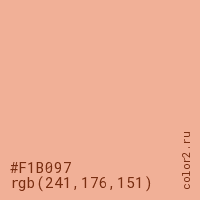 Цвет #F1B097 в цветовой модели RGB обозначается тремя октетами (241, 176, 151) в десятичном формате и #F1B097 в шестнадцатиричном (hex) формате, которые являются интенсивностью красного 241 (hex F1), интенсивность зелёного 176 (hex B0) и интенсивность синего 151 (hex 97).