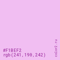 Цвет #F1BEF2 в цветовой модели RGB обозначается тремя октетами (241, 190, 242) в десятичном формате и #F1BEF2 в шестнадцатиричном (hex) формате, которые являются интенсивностью красного 241 (hex F1), интенсивность зелёного 190 (hex BE) и интенсивность синего 242 (hex F2).
