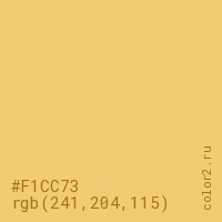 Цвет #F1CC73 в цветовой модели RGB обозначается тремя октетами (241, 204, 115) в десятичном формате и #F1CC73 в шестнадцатиричном (hex) формате, которые являются интенсивностью красного 241 (hex F1), интенсивность зелёного 204 (hex CC) и интенсивность синего 115 (hex 73).