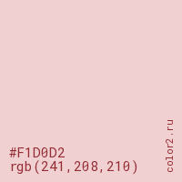 Цвет #F1D0D2 в цветовой модели RGB обозначается тремя октетами (241, 208, 210) в десятичном формате и #F1D0D2 в шестнадцатиричном (hex) формате, которые являются интенсивностью красного 241 (hex F1), интенсивность зелёного 208 (hex D0) и интенсивность синего 210 (hex D2).