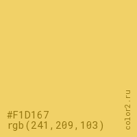 Цвет #F1D167 в цветовой модели RGB обозначается тремя октетами (241, 209, 103) в десятичном формате и #F1D167 в шестнадцатиричном (hex) формате, которые являются интенсивностью красного 241 (hex F1), интенсивность зелёного 209 (hex D1) и интенсивность синего 103 (hex 67).