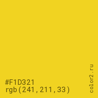 Цвет #F1D321 в цветовой модели RGB обозначается тремя октетами (241, 211, 33) в десятичном формате и #F1D321 в шестнадцатиричном (hex) формате, которые являются интенсивностью красного 241 (hex F1), интенсивность зелёного 211 (hex D3) и интенсивность синего 33 (hex 21).