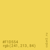 Цвет #F1D554 в цветовой модели RGB обозначается тремя октетами (241, 213, 84) в десятичном формате и #F1D554 в шестнадцатиричном (hex) формате, которые являются интенсивностью красного 241 (hex F1), интенсивность зелёного 213 (hex D5) и интенсивность синего 84 (hex 54).