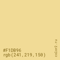 Цвет #F1DB96 в цветовой модели RGB обозначается тремя октетами (241, 219, 150) в десятичном формате и #F1DB96 в шестнадцатиричном (hex) формате, которые являются интенсивностью красного 241 (hex F1), интенсивность зелёного 219 (hex DB) и интенсивность синего 150 (hex 96).