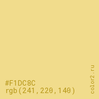 Цвет #F1DC8C в цветовой модели RGB обозначается тремя октетами (241, 220, 140) в десятичном формате и #F1DC8C в шестнадцатиричном (hex) формате, которые являются интенсивностью красного 241 (hex F1), интенсивность зелёного 220 (hex DC) и интенсивность синего 140 (hex 8C).