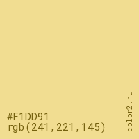 Цвет #F1DD91 в цветовой модели RGB обозначается тремя октетами (241, 221, 145) в десятичном формате и #F1DD91 в шестнадцатиричном (hex) формате, которые являются интенсивностью красного 241 (hex F1), интенсивность зелёного 221 (hex DD) и интенсивность синего 145 (hex 91).